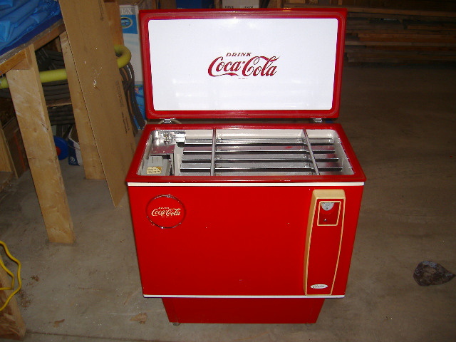 Coke Machine / old coke machine - stocker cary - 1950 coca cola vintage coke machine, sprite boy, armed services print ad.